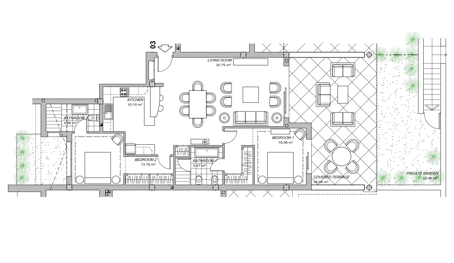 Dit voorbeeldplan in blok 1 bestaat uit 2 slaapkamers en 2 badkamers, met groot terras en private tuin. Alles wordt afgewerkt met de beste materialen en met de grootste zorg voor detail.