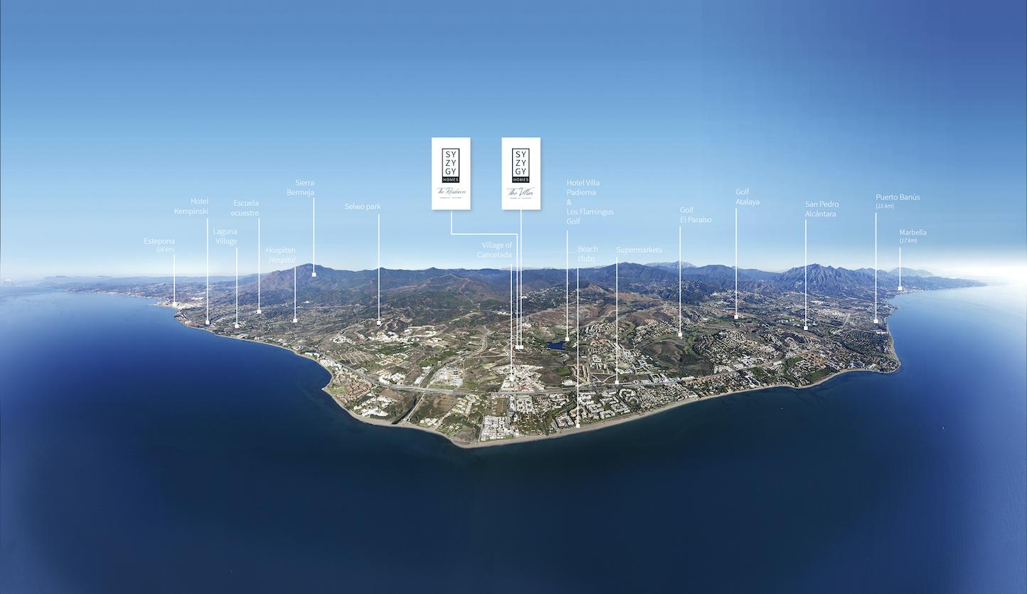 Syzygy ligt tussen Puerto Banus en Estepona, in het dorp Cancelada. Het strand ligt op wandelafstand, alsook de dorpskern van Cancelada. Sportfaciliteiten zijn nooit veraf en vlakbij zijn meerdere golfbanen te spelen.