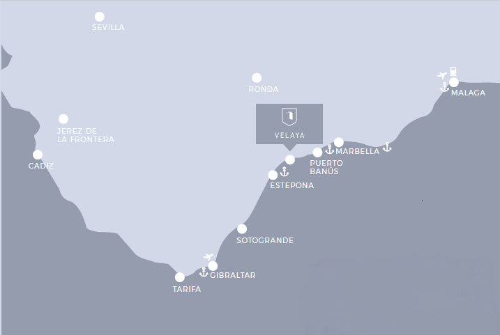 Velaya ligt tussen Puerto Banus en Estepona. Het strand ligt praktisch aan het complex zelf, alsook de dorpskern van Cancelada. Sportfaciliteiten zijn nooit veraf en vlakbij zijn meerdere golfbanen te spelen.